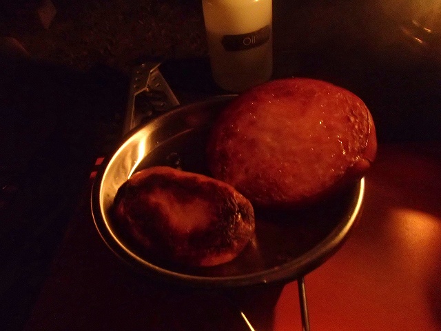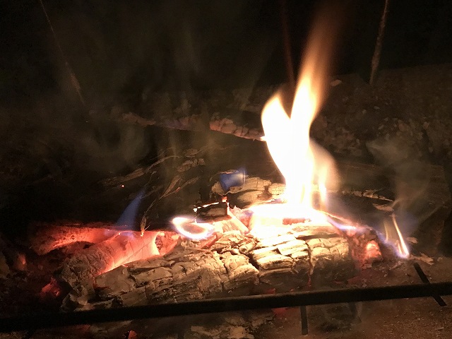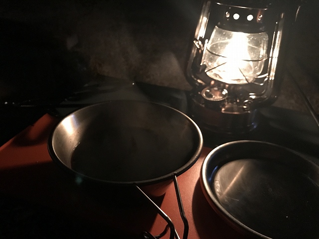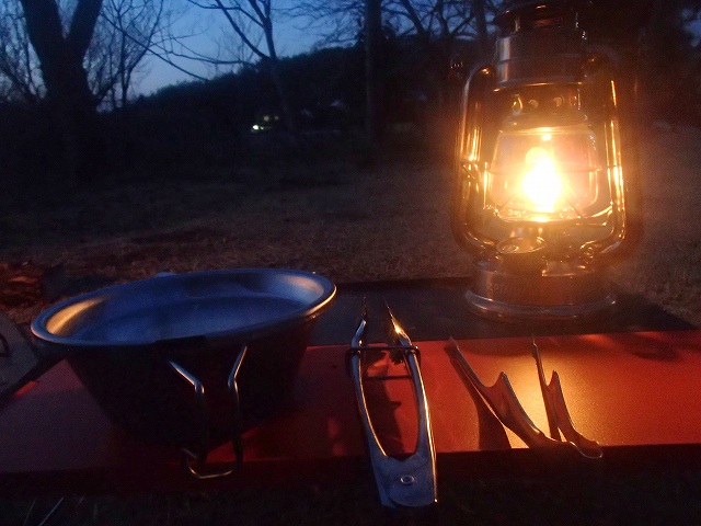 いい感じに炎が落ち着いてきたので夕食にします。ランタンにも火を入れていい感じ!
