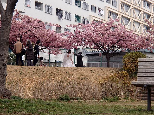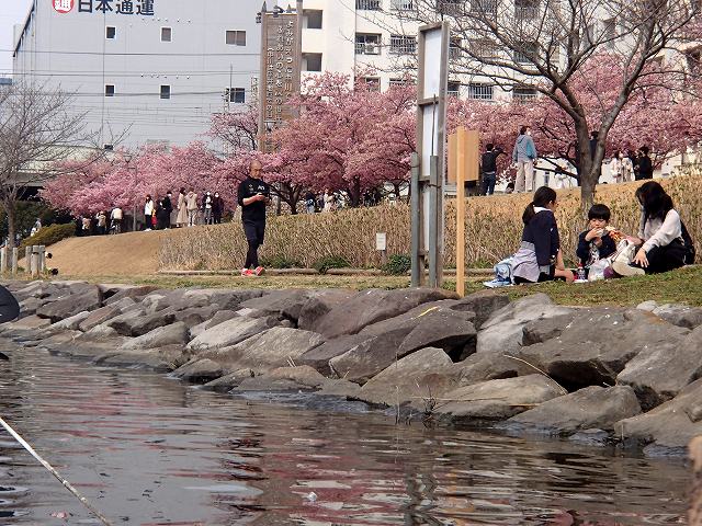 途中で河津さくら並木があって、お花見している人がいっぱいいたので、カヤックを停めて水面から鑑賞します。結婚式の写真をとってたり、ピクニックしてたり、散歩してたりいいですね〜。