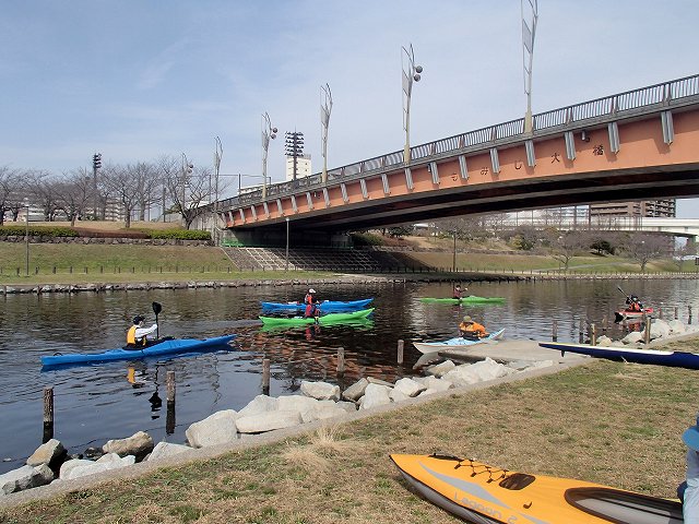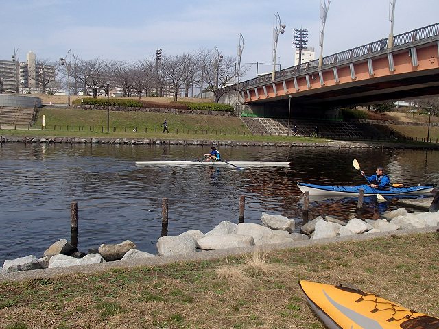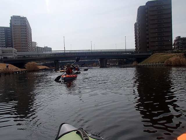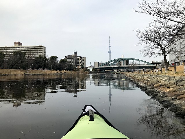 曇る時々晴れで風もないのでカヤック日和ですね。遠くにスカイツリーが見えるので目標になります。駐車場でSUPを片付けてたお兄さんに「目の前に出廷場所があるよ。右側通行だからね〜」と教えてもらっていたので右側を通行します。