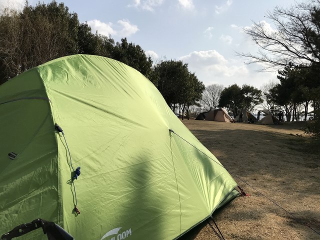 まだ、そんなにいないだろう〜。誰もいないかな?と思ったらいつも以上に混んでました。みんな、水場の近くに陣取っていたので、今回は入口近くにしました。日中は風が5メートルくらい吹いていたので、こっちの方が快適でした(って常連さんが行ってたのが聞こえてきた)。