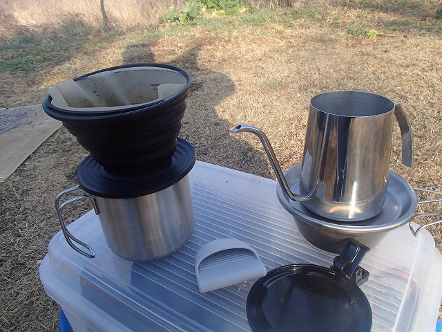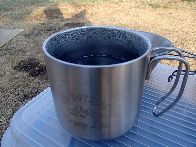 明るくなったら早朝散歩、、、いやハンモック吊れる場所を偵察してから、目覚めのコーヒー。キャプテンスタッグのマグカップと100均一のドリッパーと中華製ドリップポッドで淹れると美味しいコーヒーができます(笑)