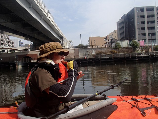 横十間川沿いのスーパーでお弁当買ってランチにしようと思ってたのですが、上陸スポットが策で囲われてたり、護岸の高さが50センチくらいあったのでちょっと怖いです。一番身軽な僕が護岸に腰かけてみるとやっぱり不安定そうだったので、一人で上陸して買い出ししてきました(笑)