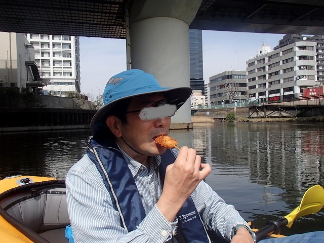 みんなのリクエストのおにぎりと串カツ(これはリクエストにはない)と除菌シート(水が汚かったので食中毒対策)を購入してカヤック上でランチタイム!やっぱり食べないと力がでないですからね〜