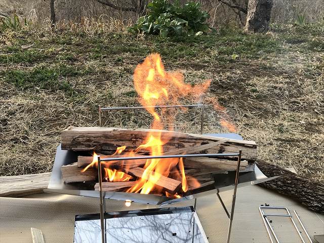 この間の春キャンプで、新しい焚火台を試してみました。これまではCAMPING MOONだったので、20センチくらいまでの薪しか使えないので、焚火の準備としてノコギリで薪を全部真っ2つにしてました。これが結構な重労働(笑)