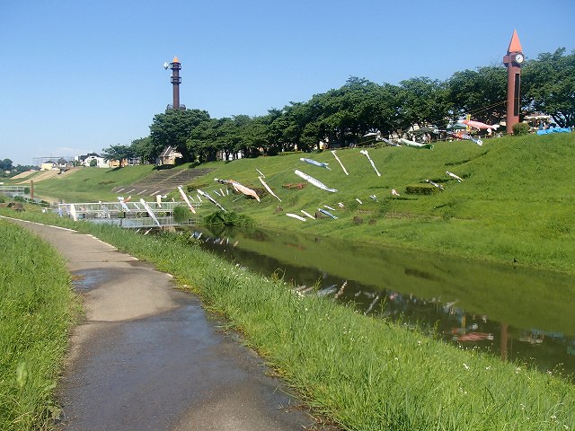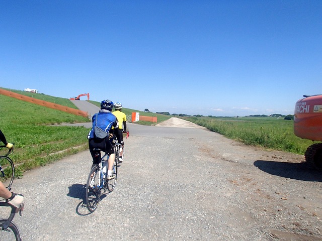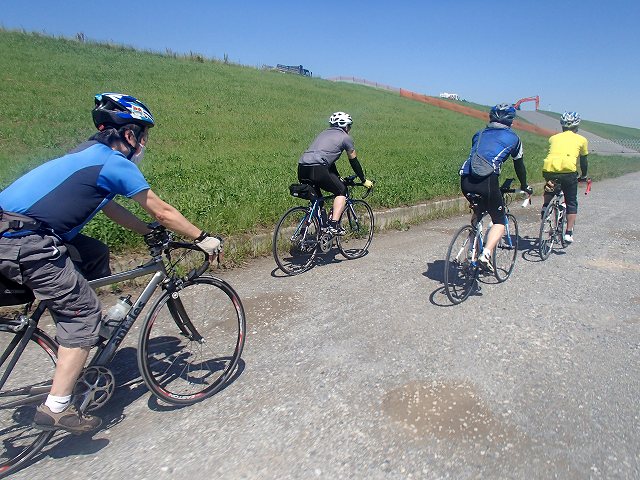 日本工業大学は埼玉県にあるので、運河河口公園で集合でした。8時30分くらいに利根運河を気持ちよく泳ぐこいのぼりがいたたので、ちょっと休憩してました。江戸川右岸を北上しています。なぜか砂利道、、、最近、サイクリングロードの工事が多いな〜。