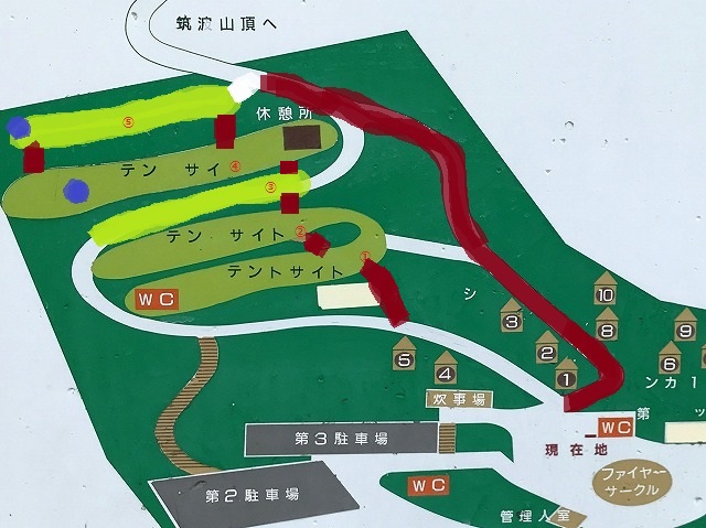 こんな感じでサイトが5段あります。右側の長いのは登山道で200段くらいの階段です。サイト2まではスロープなのですが、それ以降は階段だけです。夜景が拝めるのはサイト345らしいです。展望のいいのはサイト45ですが、階段がきつい!。