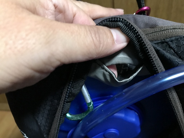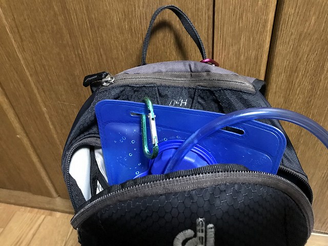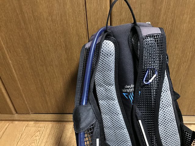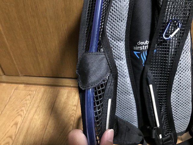 カラビナつけて干してたので付いたままですが、ハイドレーションバッグウを吊り下げるストラップはリュック側に初めからあるので吊り下げて、これまた最初からあるパイプを通す穴からパイプを出して、リュックのストラップについているパイプ止めのマジックテープで固定します。すごい!さすがハイドレーションバック対応のリュックだ!