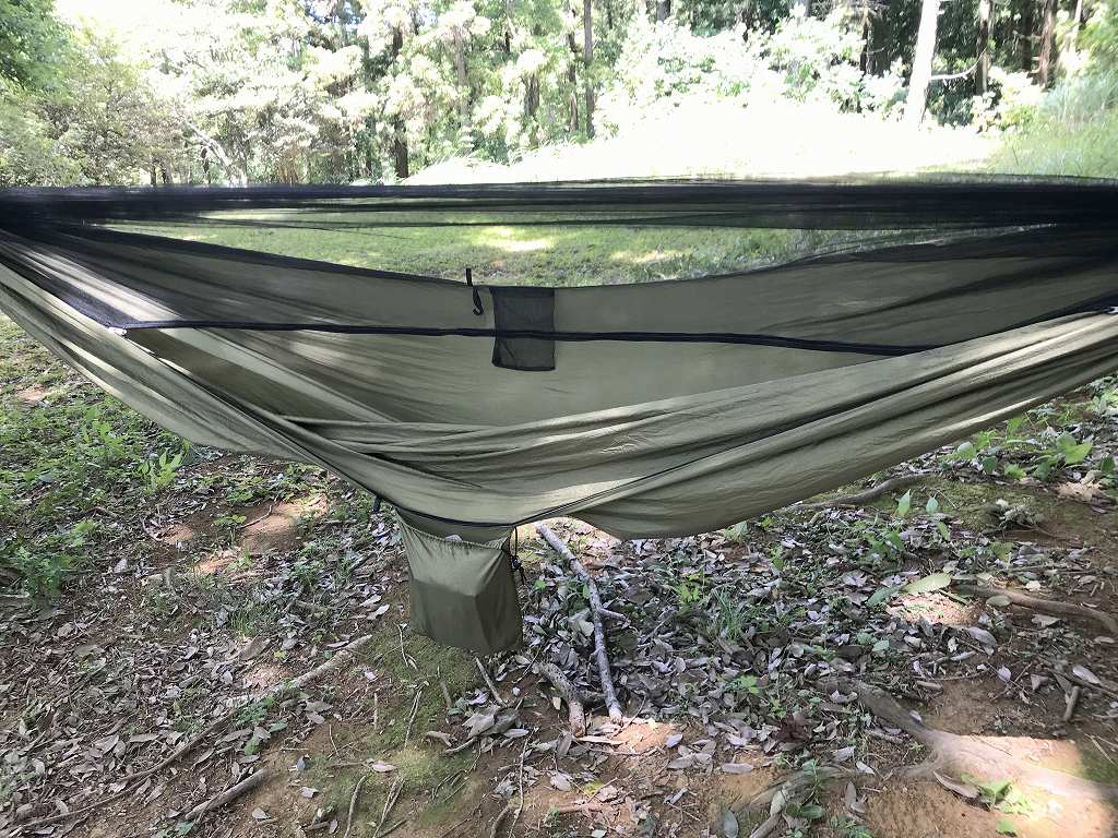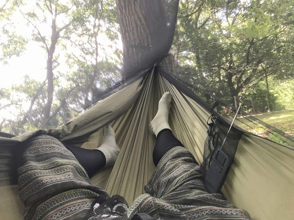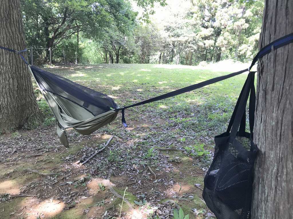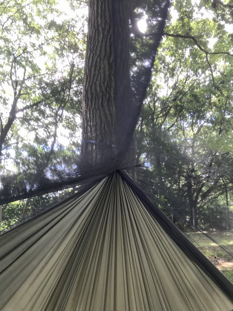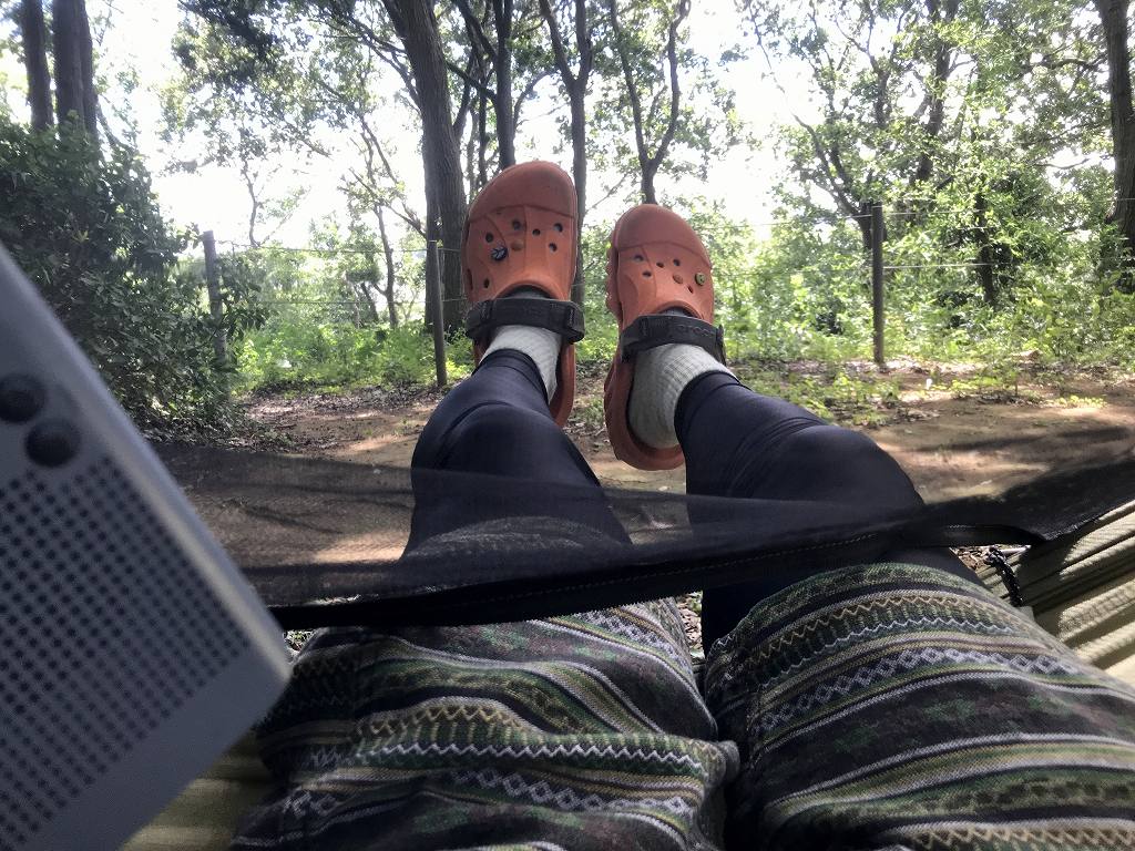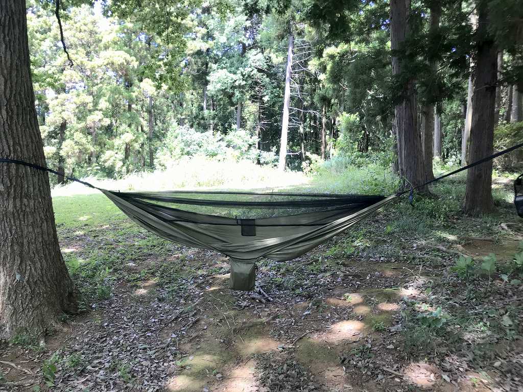 僕のハンモックには蚊帳が付いているので虫に刺されるリスクは低いです。風がちゃんと通るか心配でしたが、風速4メートルだと涼しい風が吹き抜けて行ってました。風で結構揺れて気持ちいいです。斜めに座ったり、足を出してみたり、あぐらをかいてみたりしてみましたが、斜めに座ってあぐらをかくのが一番安定していますね。