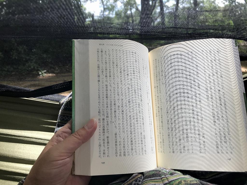日陰で風に吹かれるにはハンモックは最適なのです。時々、利用する森に入って誰もいない場所まで来たらハンモックを吊るせる場所を探します。いつもは自転車で来て数少ないベンチを占有してしまうので、ハンモックの方がいいかもしれません。