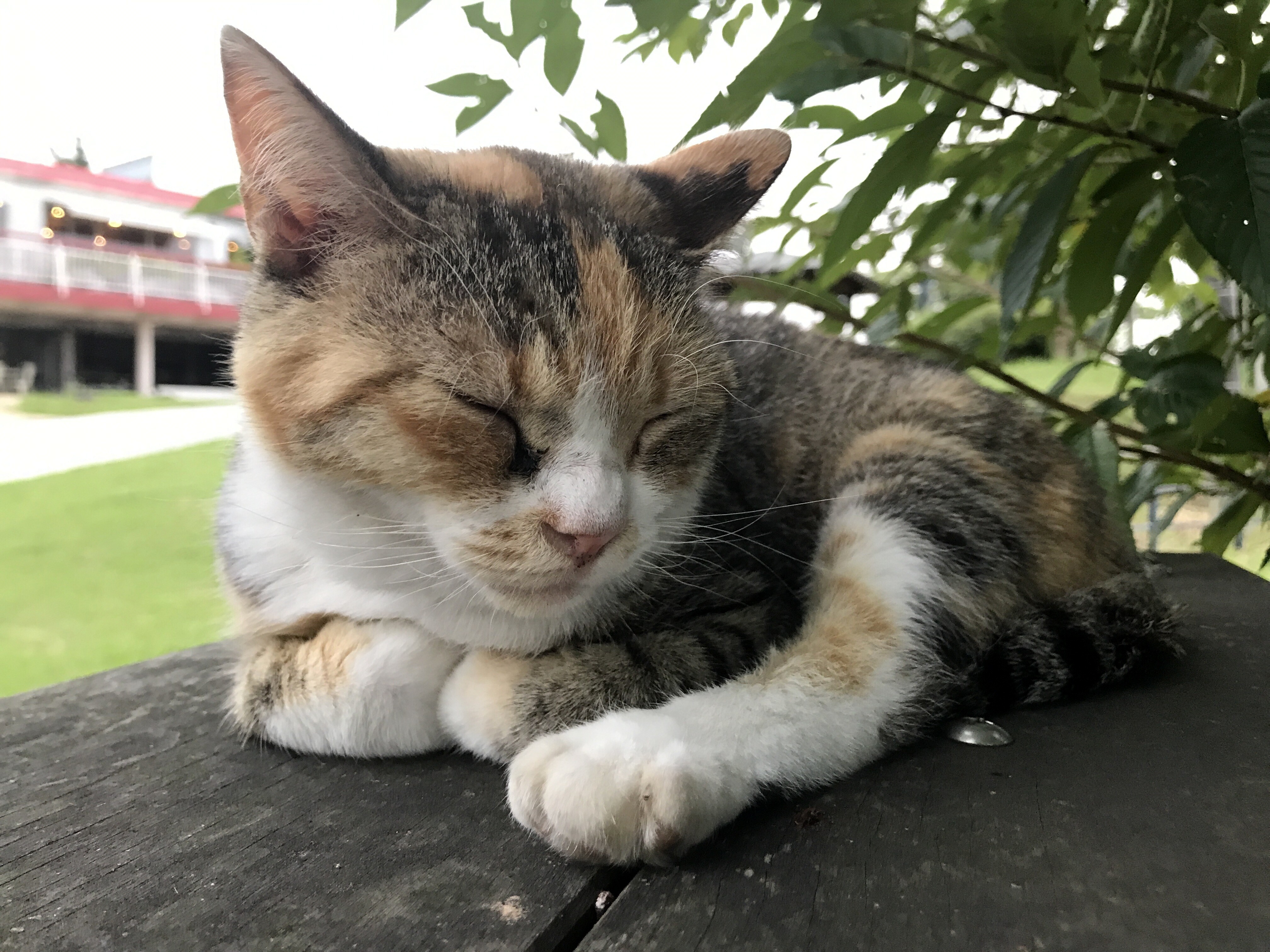 と落ち着きがない三毛猫です。飼い猫なので逃げませんが、すり寄る感じでもないのでフィッシングセンターで外飼いしている猫なんでしょうね。
