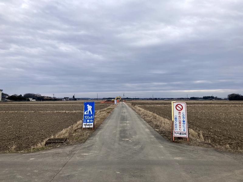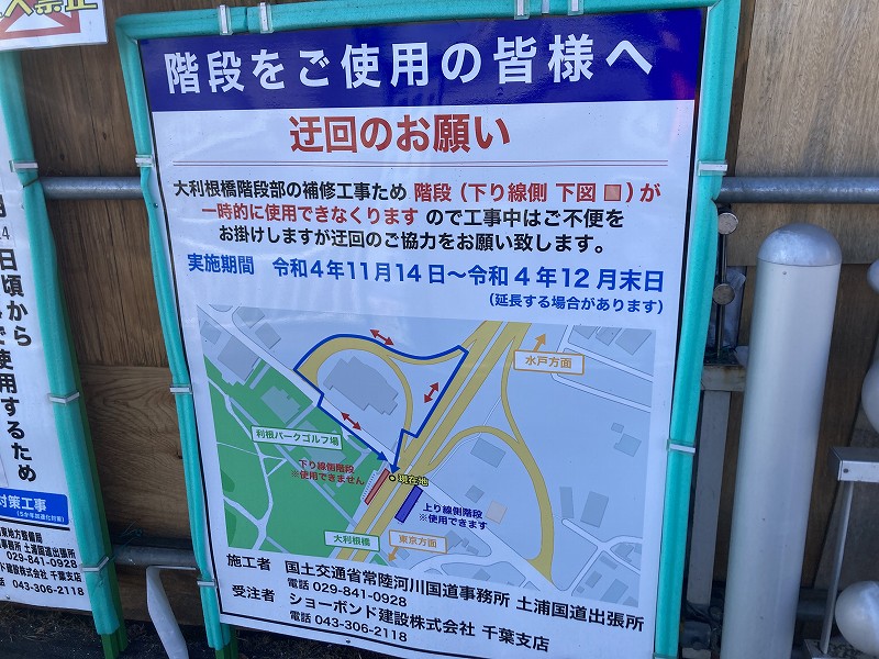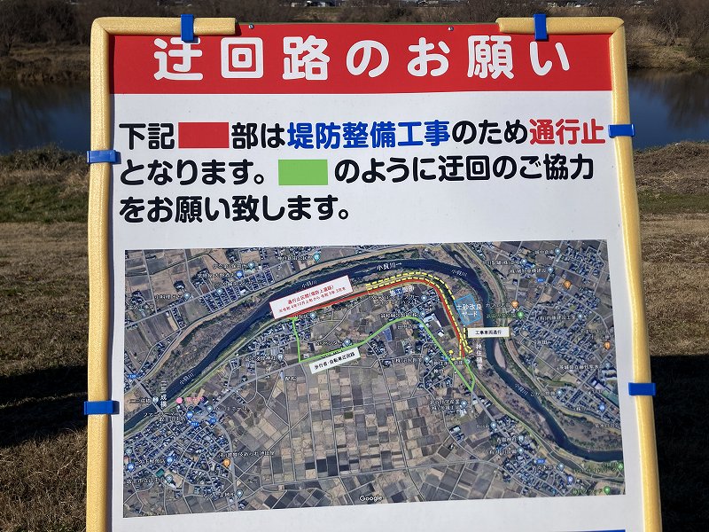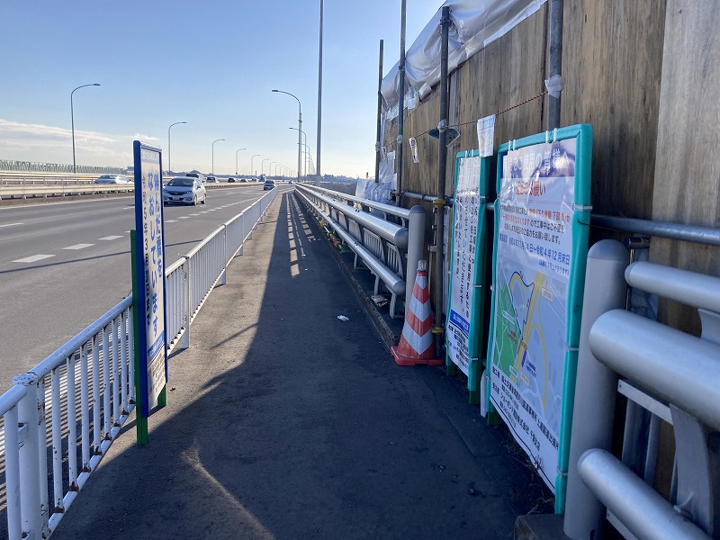 利根川相野谷親水公園から利根川サイクリングロードに戻ってみると、6号線に上がる階段が工事中だったので、車のルートを使って歩道にアプローチしました。12月までの予定だったみたいですが、工期が延期されてるんでしょうね。