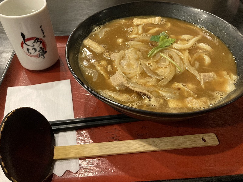 これが名物のカレーうどんです。僕は大汗かきなので嫁さんのを少し食べるのが普通なのですが、単身赴任なので初めて1人で食べたけど、やっぱりめちゃくちゃ美味しかった!めちゃくちゃ大汗をかいたので温泉が台無し(笑)