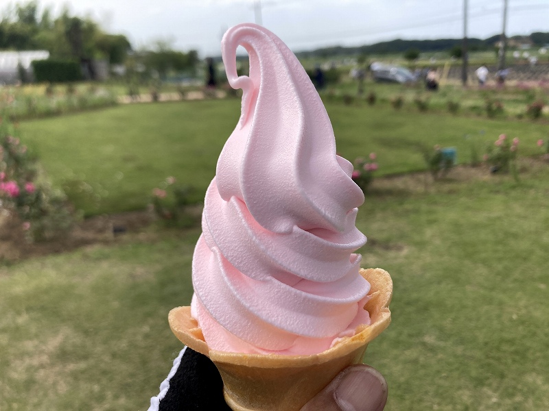 僕はきつい香水が苦手でバスボムショップがあると逃げます(笑)でも、ラベンダーソフトは美味しかったので、バラソフトにチャレンジしてみました。味は普通のソフトクリームですが、ほんのりバラの香りがする程度で美味しかったです。並んでるお客さんも「ラベンダーとストロベリーどっちにする?」とバラソフトがメニューにないので気にもしてないみたいです。もったいないから今度からメニューに書きましょうね〜