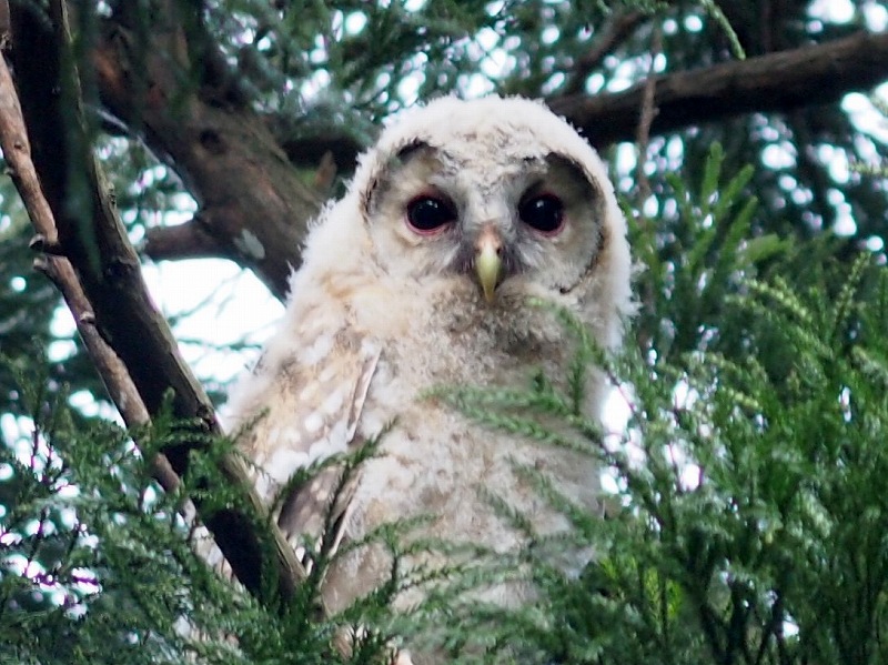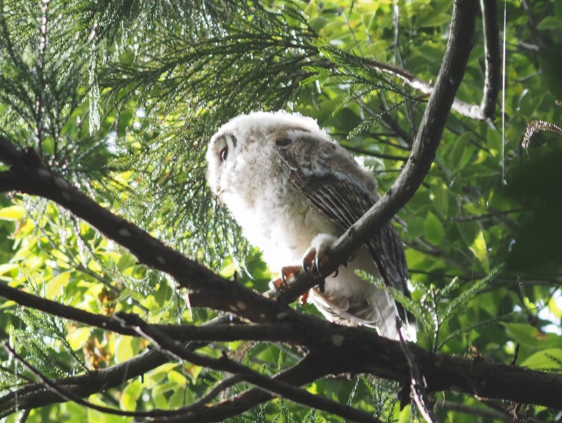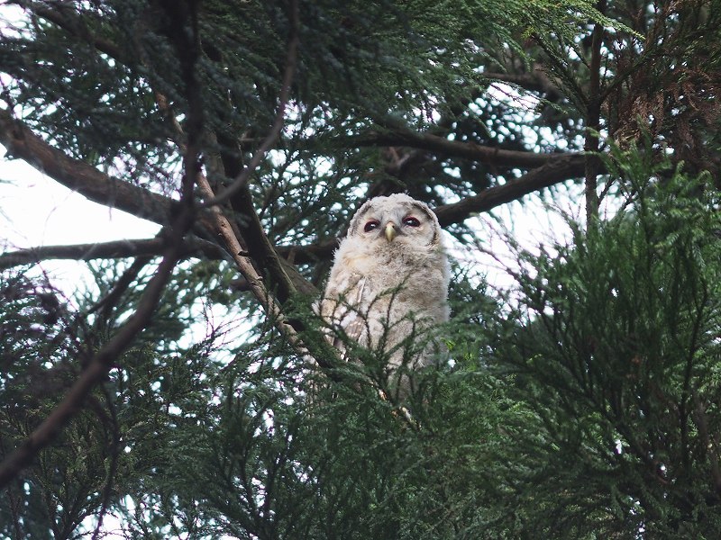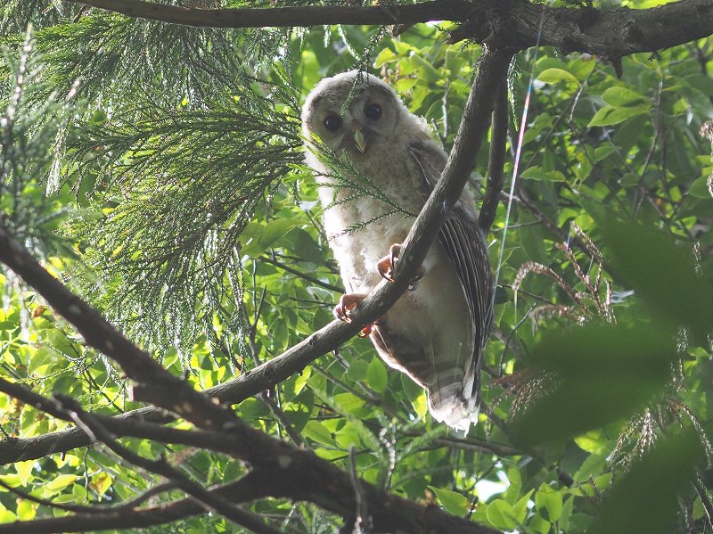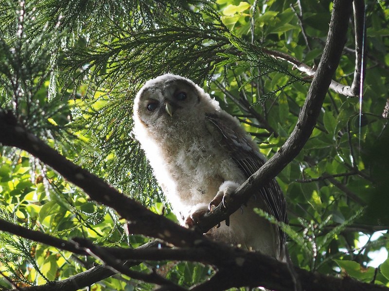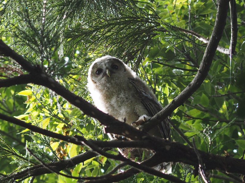 今日は風速3メートルを超える予報だったので自転車はお休みです。天気は良いのでホームの森で野鳥撮影してきました。森の真ん中で林の中をゆうゆうと飛ぶ黒い姿を目撃したので探していたら、、、フクロウ、、、なんだけど赤ちゃんがいました。
