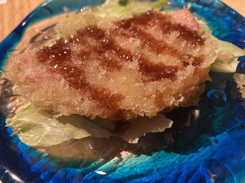 ちょっと休憩(笑)いや、「ハムカツ」は薄ーいんですが衣サクサクで美味しい!「新玉のサラダ」も塩辛さを中和してくれるのでさっぱりします。