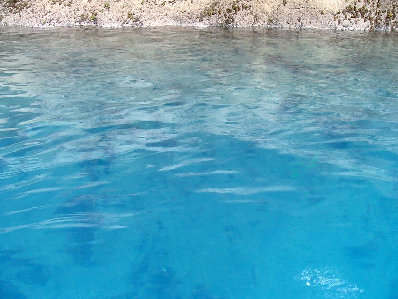 カヤックで漕ぎ出した時には曇っていたので「ブルージルコン」です。それでも予想以上に青い。