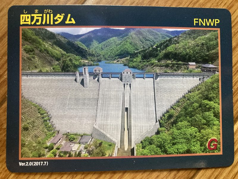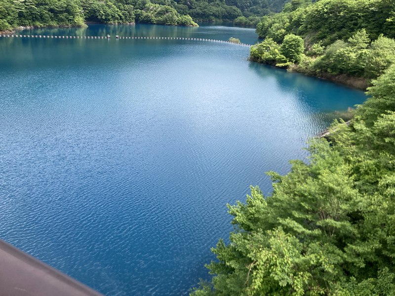 到着した場所は奥四万湖です。四万川を四万川ダムで堰き止めて出来たダム湖です。光の当たり具合で緑がちょっとブルーに見えるくらいを想像していましたが、めっちゃ青いですね。雲も映りこんでいるのできれいな青に見えまが、右端辺りが「セルリアンブルー」ですね。平日しか直接もらうことが出来ないダムカードより青い(笑)