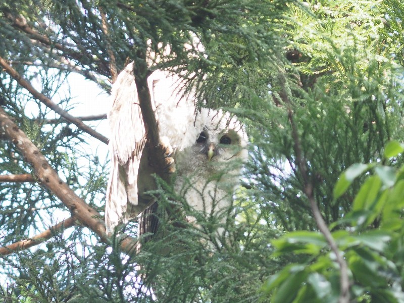 親フクロウは15メートつくらい離れたところからジッと見守ってました、暗いところや木の陰になるところにうまく入るので撮る事はできませんでしたね。
