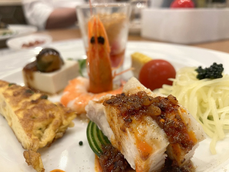 前菜です。大皿でどん!がこれまでのパターンだったのですが、今回は少人数なのでちょっと変えてみたとのことで、コース料理のような盛り付けで、どれも美味しいです。特に蒸し鶏の香辣ソースがピリッとしてて美味しんですよね〜