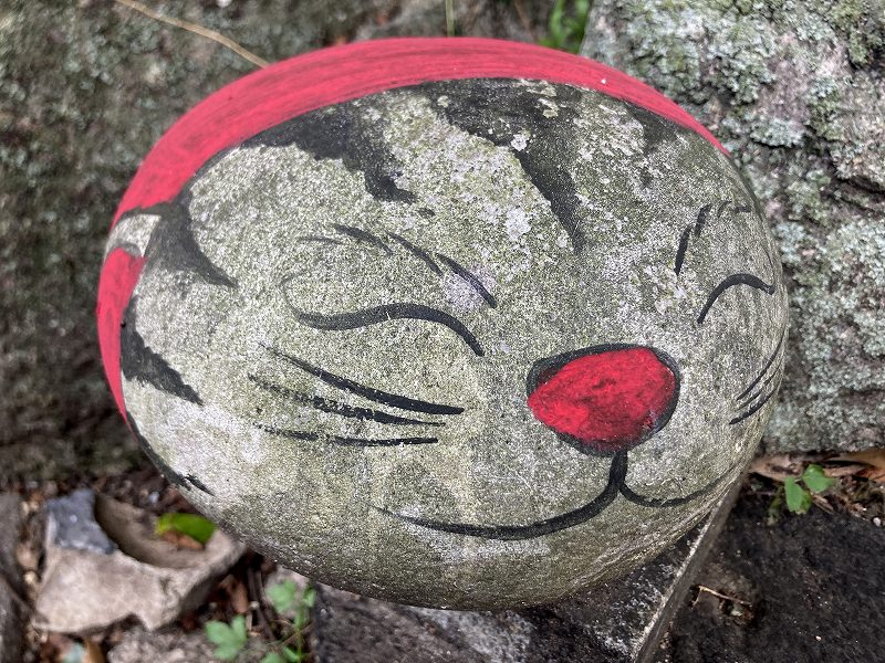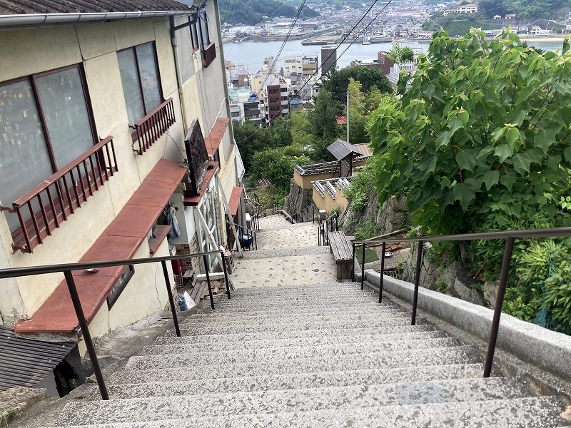 そして有名な猫の細道ですね。暑すぎて猫は居ないけど、よく見る石の猫たちがいっぱいです。下りは足に来るので下り切ったところのお店でクーラーにあたりながら、八朔ソフトと八朔プリンを食べてクールダウン。