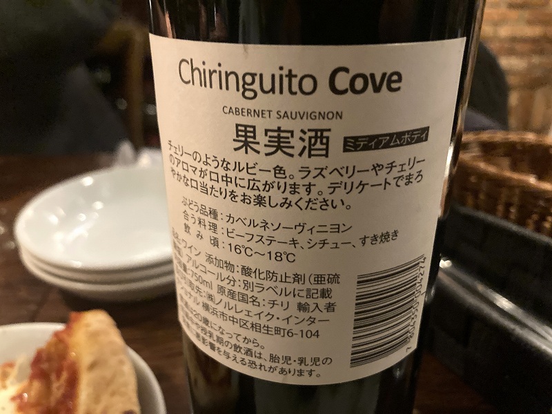 お肉来そうなので赤ワインにしましたが、お代わりしたら「ボトル置いておきますね」っておいて行ってくれたのもうれしいですね〜。ミディアムボディーのチリワイン「チリンギート コヴエ」は美味しいワインでした。(これで600円なんですね)
