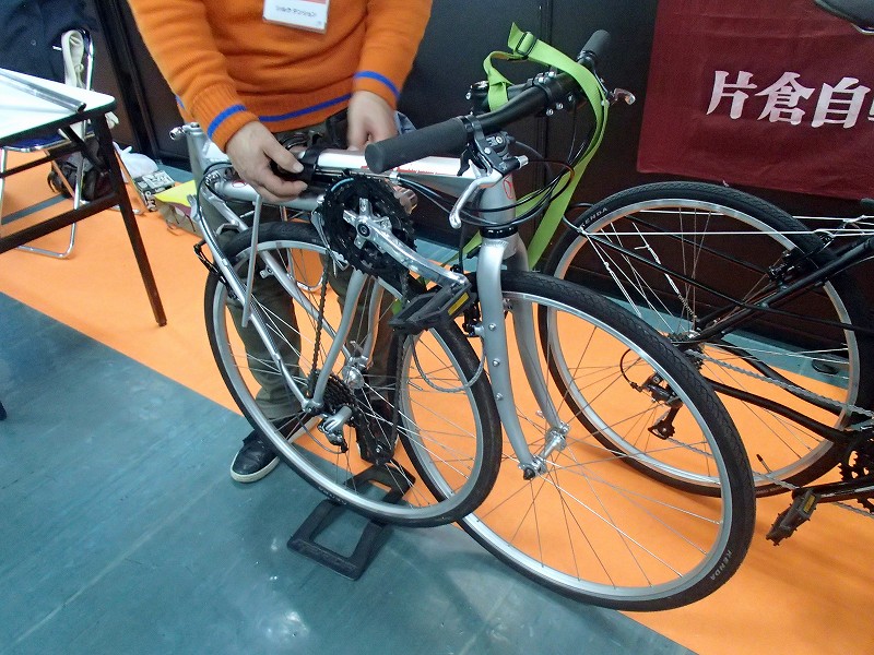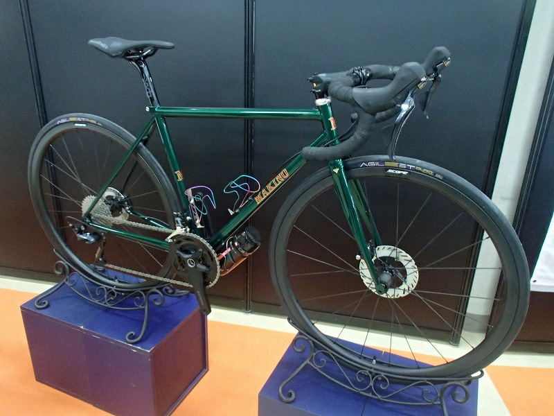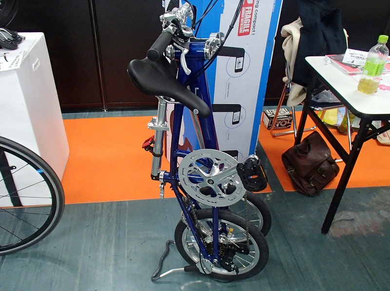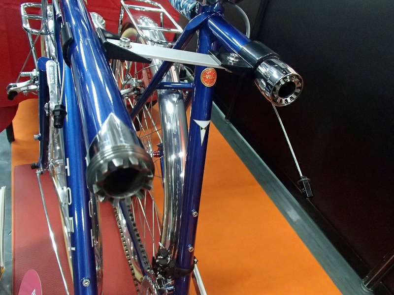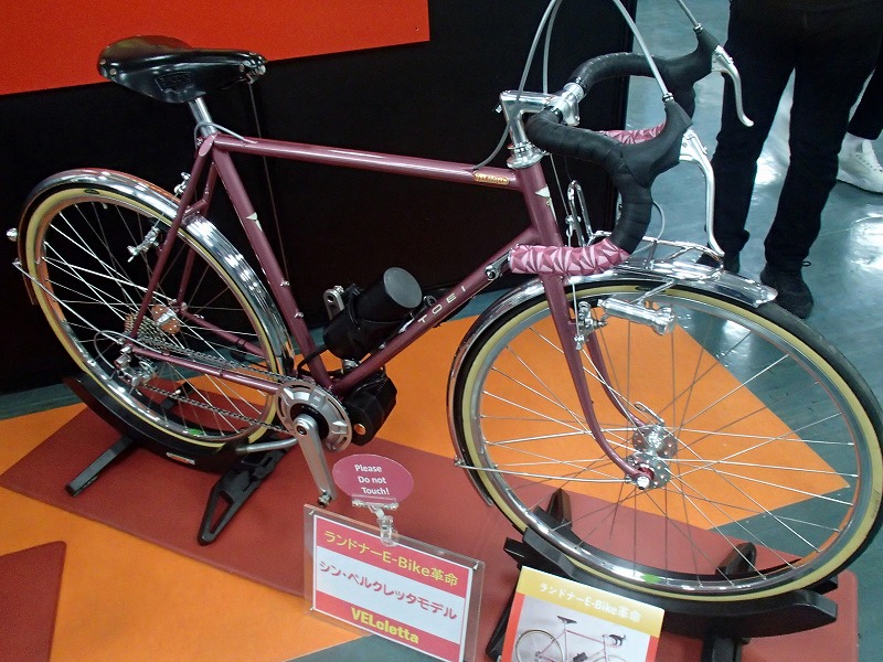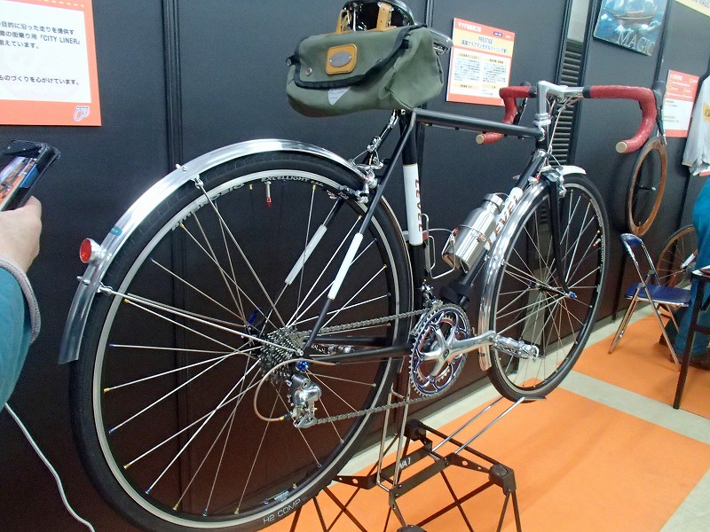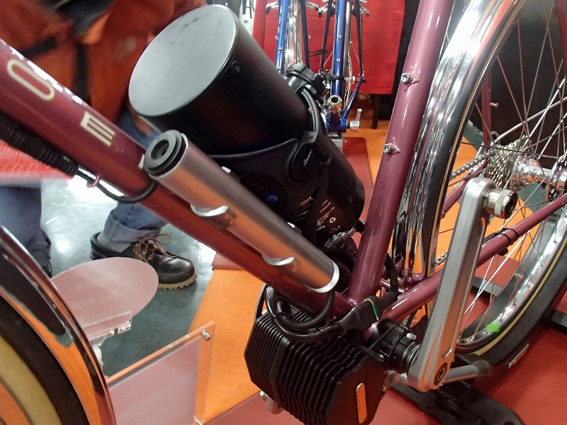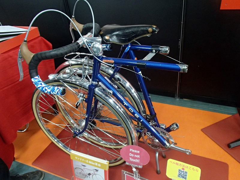 TOEIと協力してデモンタブルのランドナーと電動補助付きランドナーを展示されていてどちらも綺麗な自転車です。電動の機構が面白そうでチェーンホイールの内側にもギアがあってモーターがアシストするようです。フレームはそのままに電動化できそうなのでみなさんが食いついてましたよ(笑)