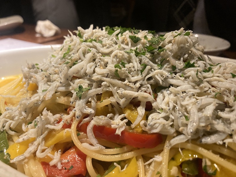 ペペロンチーノがでてくるので白ワインを注文したら「ボトル置いておきますか?」って聞いてくれました。うれしかったんですが、みなさん白ワインじゃなかったのでグラスワインにしましたが、やっぱり御代わりしちゃいました。美味しかった〜