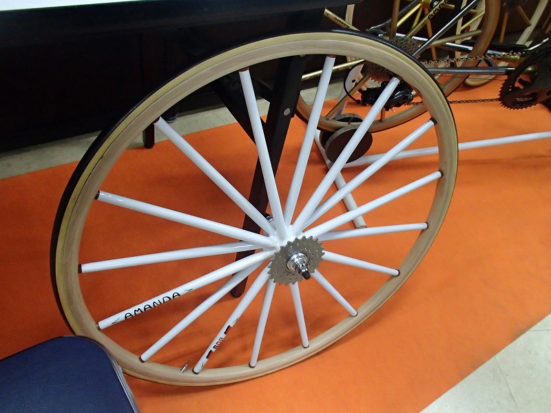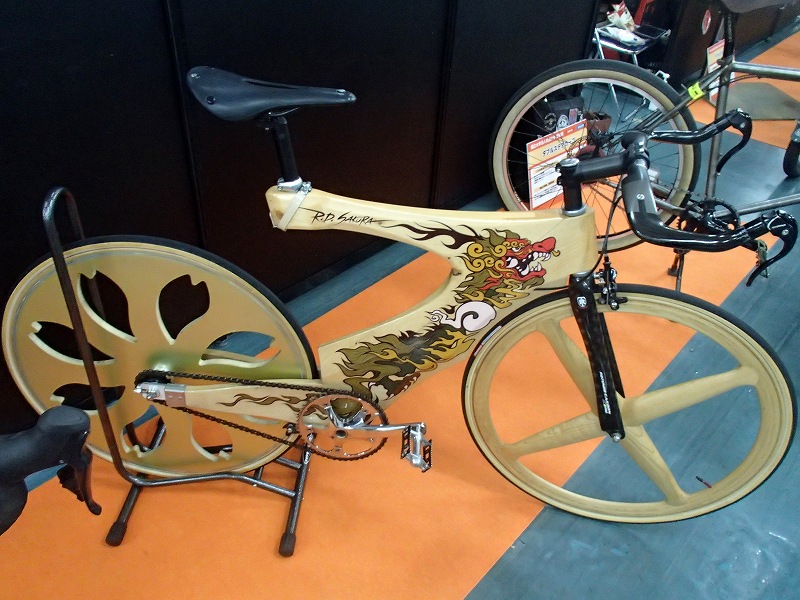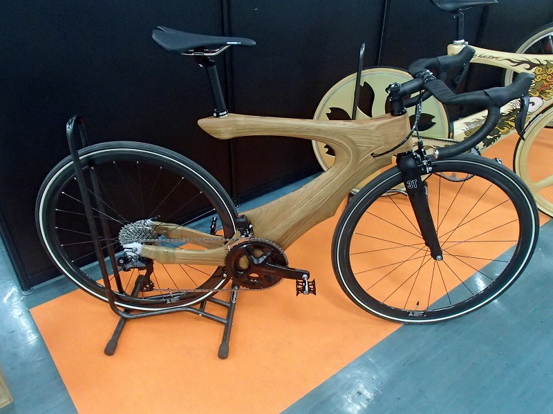 北海道の木のクラフト工房ペッカーの社員さんが作った自転車です。シュリザクラで出来ているらしく、地元の木材で作ってという依頼があれば面白いものが出来そうです。フレームを作る過程の写真をいっぱい見せてくれて面白かったです。