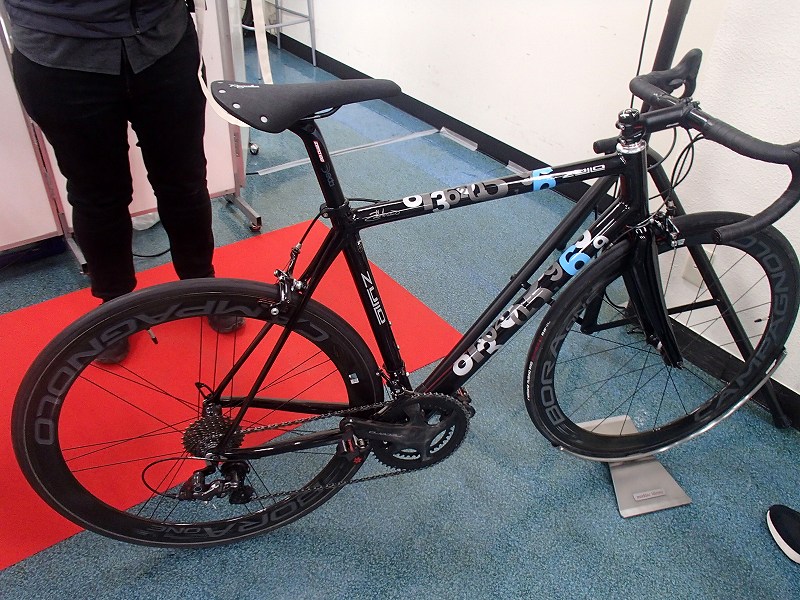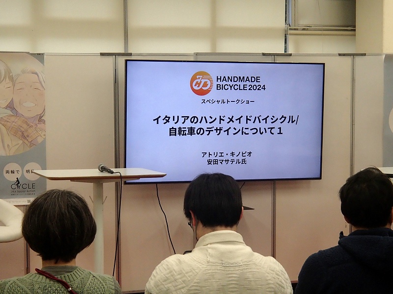アトリオ・キノピオの安田マサテルさんが登壇されるのでズッロの話がメインかと思ったのですが、イタリアのハンドメイドバイシクル全般の話で面白いエピソード満載でした。ズッロのカーボンバイクも展示されてました。ハンドメイドバイシクルは素材が限定されるわけではないのですが、クロモリじゃないんだ、ちょっとだけ残念な気分です。