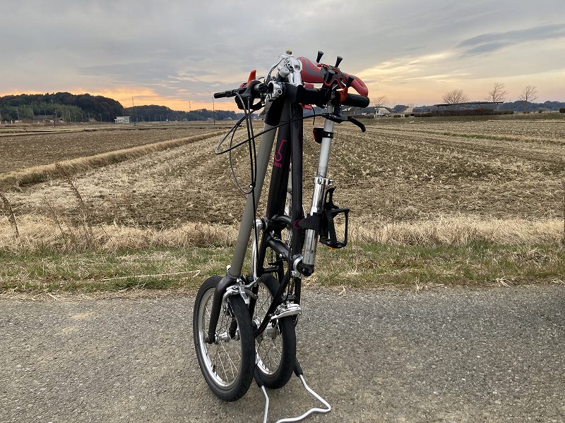 ダウンチューブを中心に後ろ三角がくるっと横に折れて、フロントフォークが折れる事で折りたたまれる。トップチューブはデモンタブルの構造でしっかり固定できるみたいです。ここの動画をみてやっと折り畳み方法があ分かりましたが、決行小さかったです。