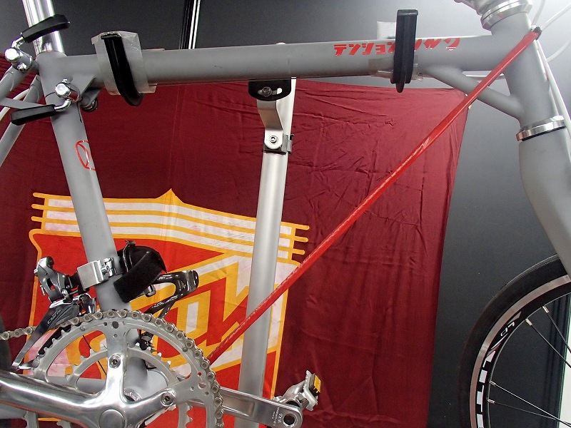 後ろ三角がくるっと縦に折りたたまれるのですが、シートチューブのヒンジを中心に折れるのが新鮮です。シートポストがストッパーになっているので走行中に折れることは絶対にないでしょうね。そして、前三角のダウンチューブがワイヤーになっているところが驚きです。そういえばDAHON K3もそうでしたね。
