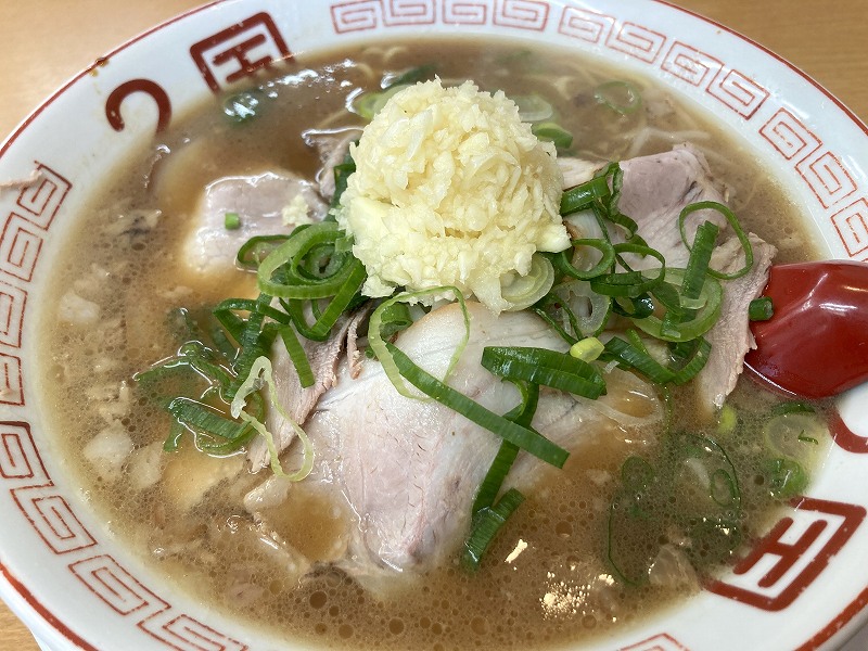 いつもは「二国ラーメン」という全部乗せを食べてましたが、今回は「ニンニクラーメン」です。昔はニンニクとネギは自分で載せ放題でしたがコロナの影響か?メニューになってますね。この生ニンニク4つ分くらいの塊が怖い(笑)