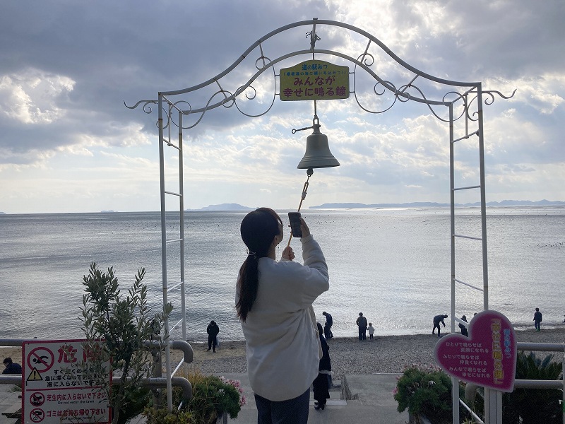まず、最初に向かったのは「道の駅みつ」です。釜揚げシラス丼を食べるつもりでしたが20組待ちだったので断念し、みんなが幸せになる鐘を鳴らしてから、愛媛出身の両親に瀬戸内の魚を土産を買いました。道の駅って案外値段が高いイメージあるけど、ここは本当に安いし新鮮です。(ミシマオコゼ6匹で500円とマルアジ2匹で300円とカキいっぱいで1500円くらい。エイもあったかな。瀬戸内ならではの名前で売ってたりするのでわからない〜)