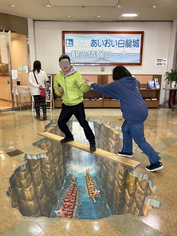 お腹すいたので途中にあった「海の駅 あいおい白龍」で揚げかまぼこ(愛媛では天ぷらっていうけどね)を摘まんで日向ぼっこ。めちゃくちゃ座り心地のいい椅子がテラスにありましたが、こういうトリックアートがあると必ず娘に写真を撮ってもらてる(笑)