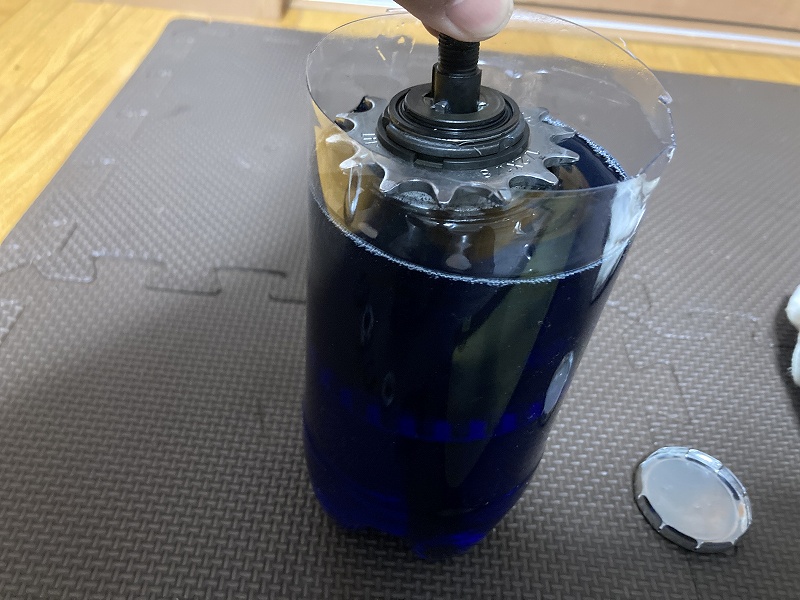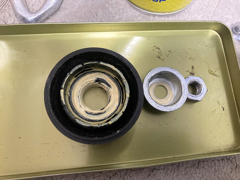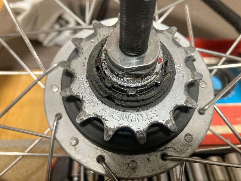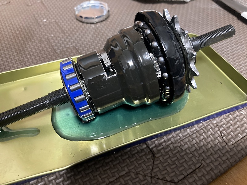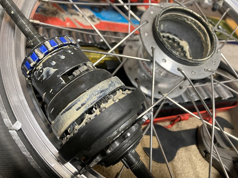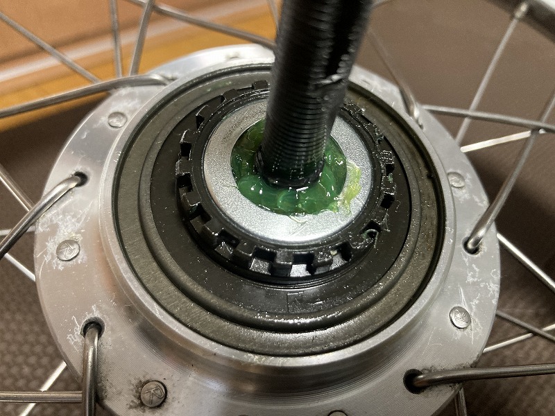 グリスを塗ったシェルに本体を入れて、ハブのベアリングにいっぱいグリスを注入しました。この時にフロントハブも一緒にグルスアップしたのでハブの回転はゴリゴリじゃなくなりました。