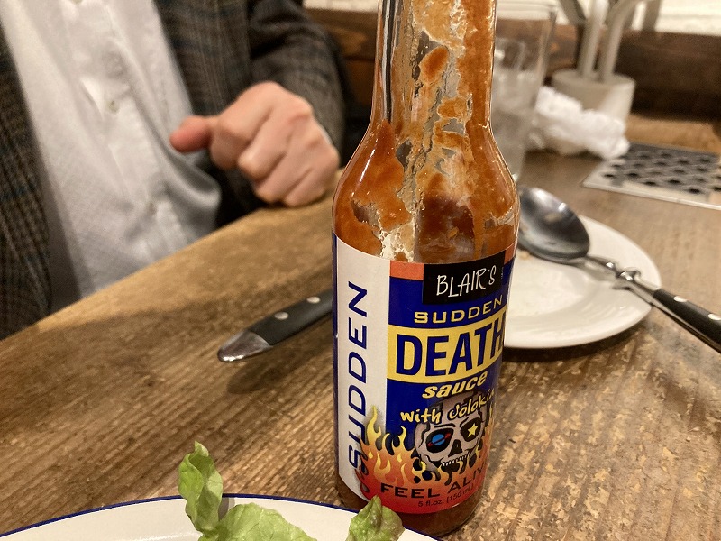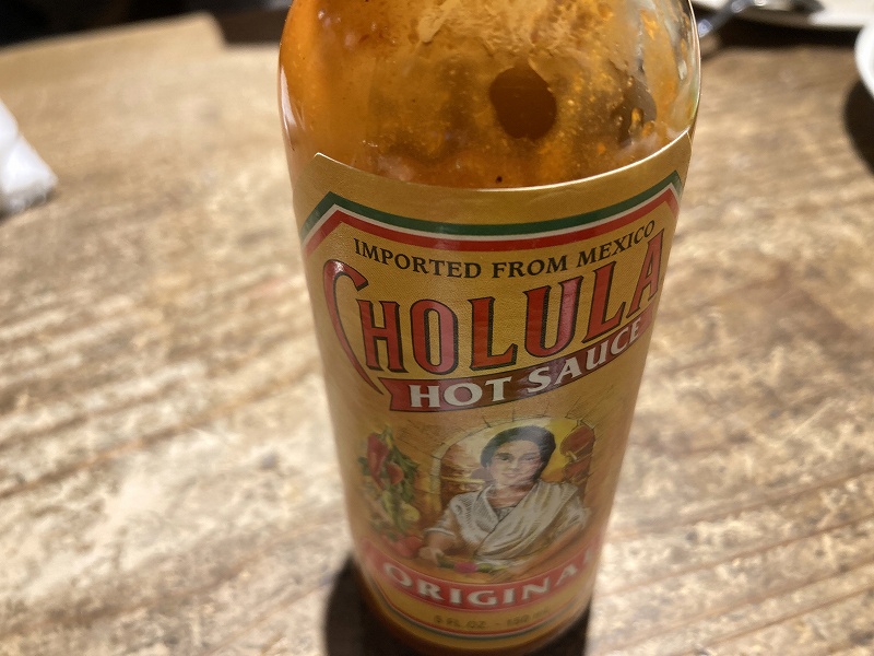 料理にはソースが付いてくるけどどれもピリッと辛いです。テーブルにはいろんなホットソースがあって、一番辛くなさそうなのはチョルーラ オリジナル ソースで、一番辛そうなのはDEATHソースです。怖いもの見たさでトルティーヤチップスに1滴つけて食べたら死にました(笑)