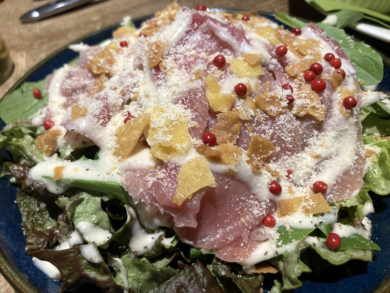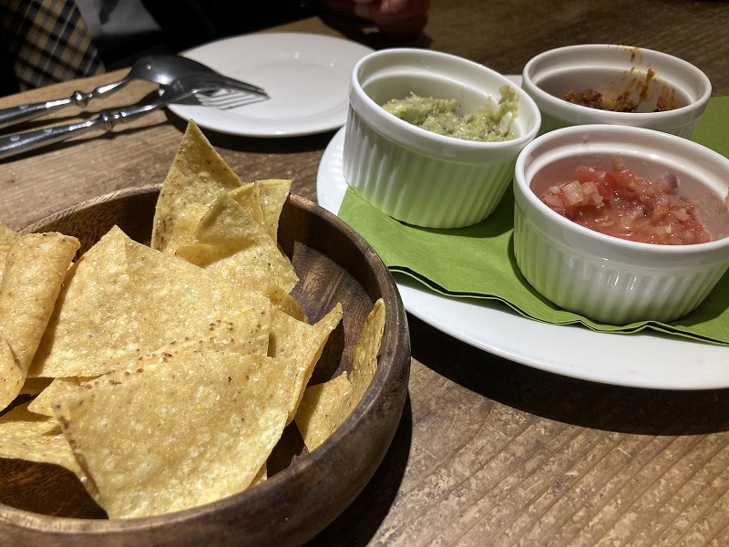 3種のディップ(チリビーンズ/ワカモレっていうアボカドディップ/サルサ)です。トルティーヤチップスに付けて食べます。そのままでも美味しいのでトルティーヤチップスだけを3回もお代わりしちゃいました!
