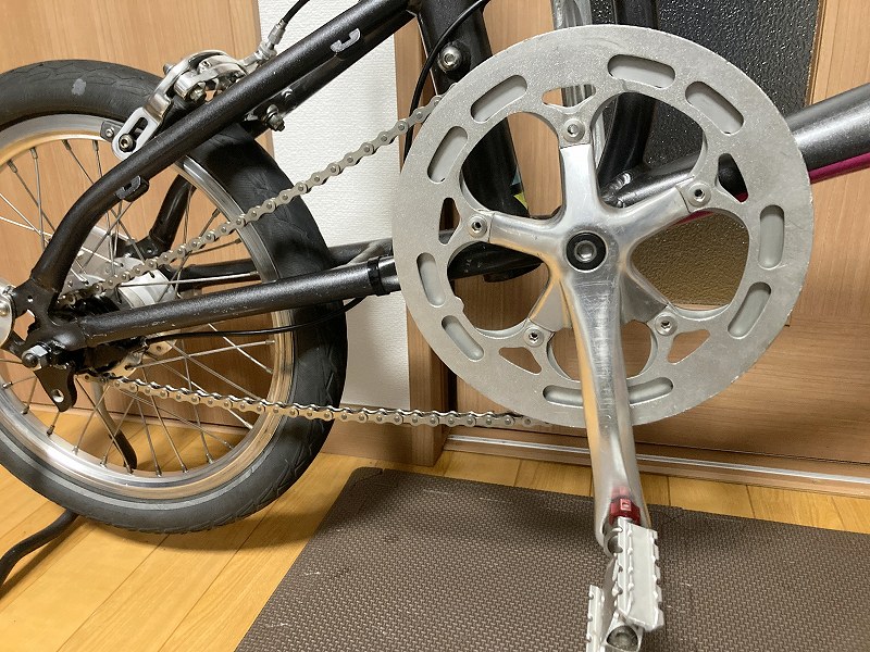 今回のメンテナンスでフロントクランクとチェーンリングをDAHONと交換したのでフロント56Tになってチェーンが不足するので新しいチェーンに交換したのでメンテナンスとしてはすべてのパーツを交換またはグリスアップしたことになりますね。これで快適な輪行マシーンになってくれるでしょう〜