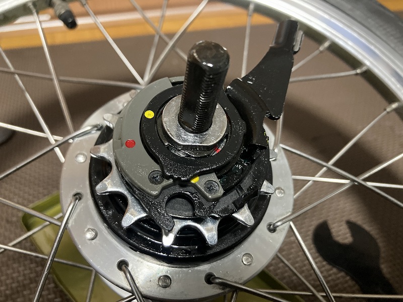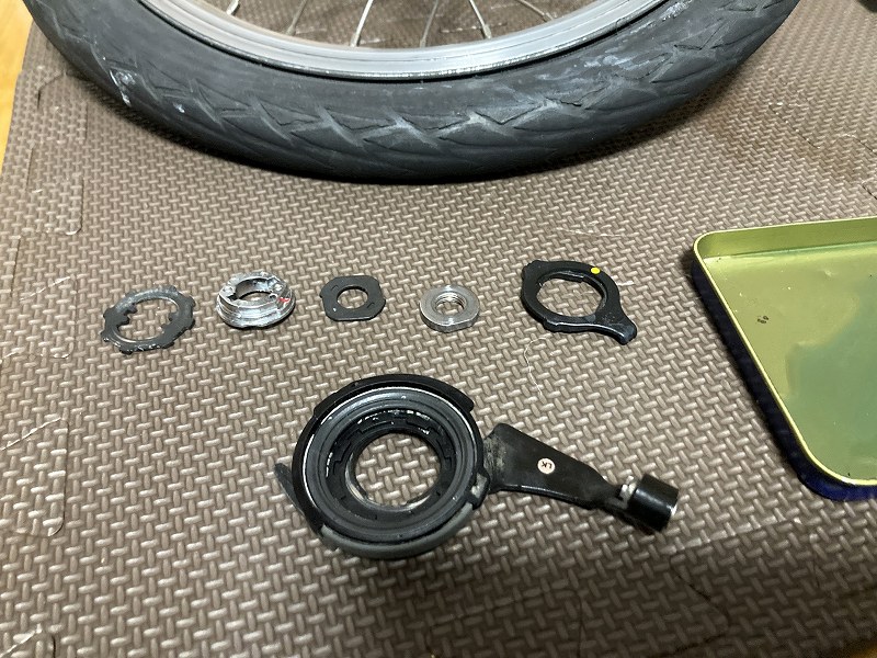 最初は前後のハブがゴリゴリだったのでグリスアップのためにばらしましたが、どんどんバラバラに、、、。このロックを逆方向に回すと、カセットジョイントが外れます。いパイパーツがあるので写真を撮って順番を記録しておきます。逆のナットも外したら内装5段のメカが出てきました。が、なんか汚い。