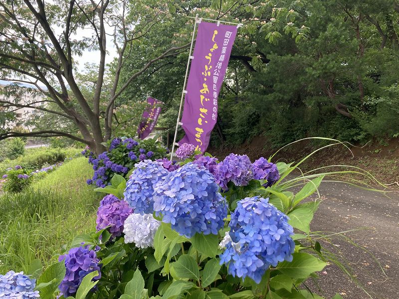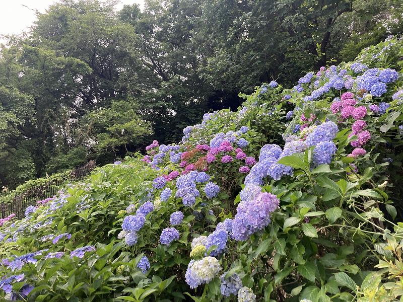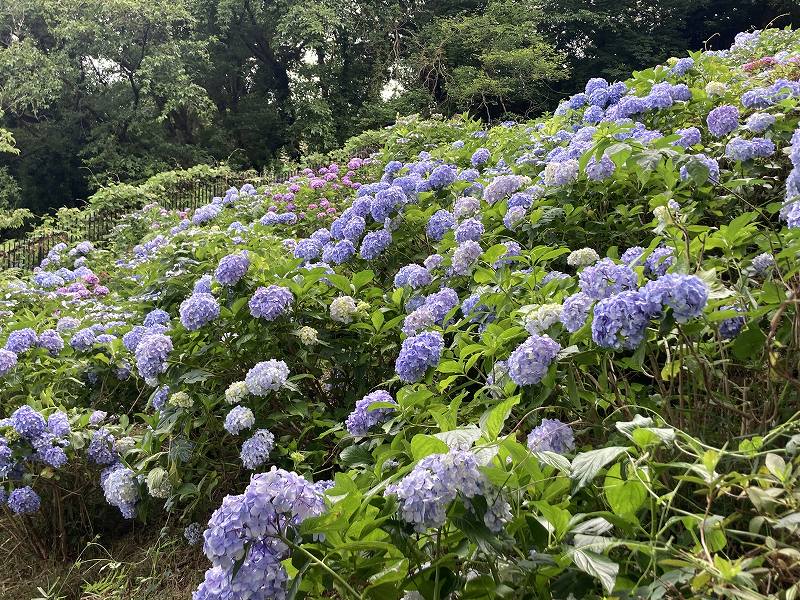 帰る前に反対側の入り口を見ておこうと思ったら、こっちは咲いてました。ま、終わりかけではあるけど株の数はすごかったですね。満開だったら流山のあじさい通りくらいありそうです。ここは公園だけど無料なんですね。