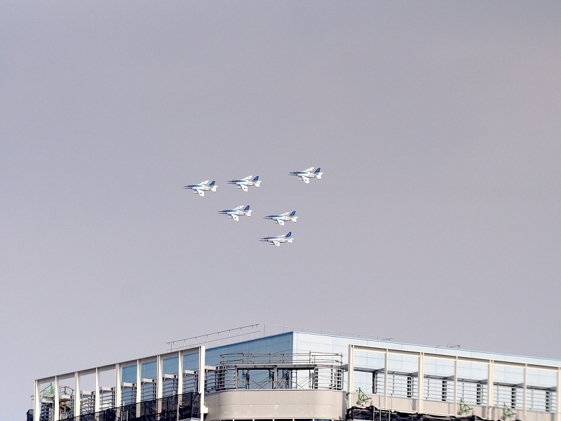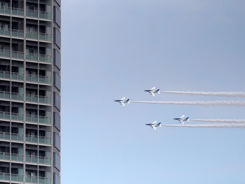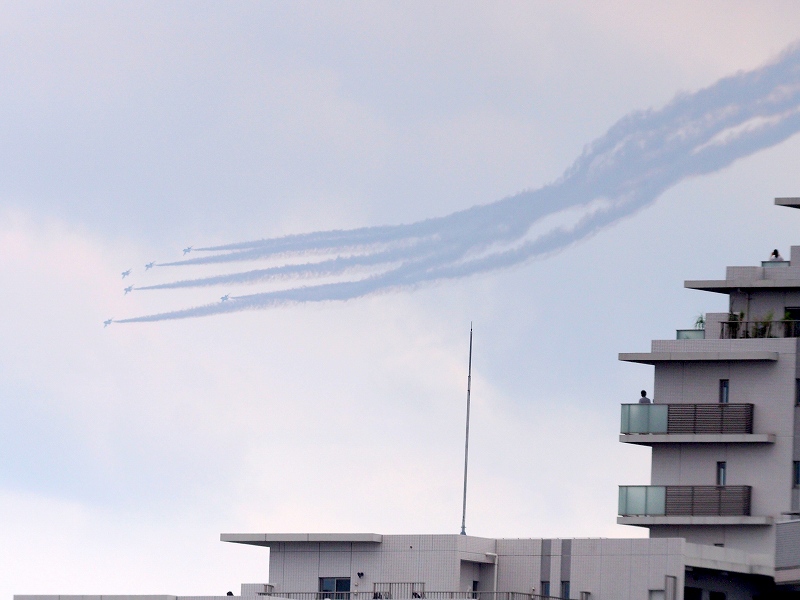 二子玉川のタワーマンション?の上や後ろを飛び回る姿は航空祭では見られないので、都会での展示飛行ならではですね。キーンという音が小さめでエンジン出力控えめな感じがしましたがどうなんでしょうね?それでもカッコイイ飛行を見せてくれました。