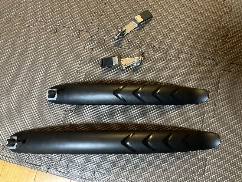フォーククラウンとリアブリッジにねじ止めする金具(鉄?アルミ?錆びるかも??)に脱着式のプラスチックのブレードを付けるタイプです。ロードバイクようなので長すぎますね〜。とりあえずフロントとリアを交換したらリアはそのままでも使えそうです。でもフロント部分をバッサリと3分の1くらいにカットしたらバランスを考えてリアも少しカットしてみたらいい感じになりました。