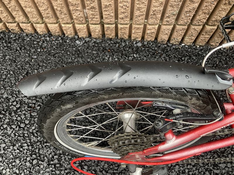 ちゃんと泥除けとして機能するのかわかりませんね。今日は雨が降っていて夕方にはあがったので試走してみることにしました。雨の日の子供のように水たまりに入りまくったけど、泥はねは全くなかったみたいです!!雨上がりにゆっくりと駐車場まで往復するくらいだと役に立つでしょう〜