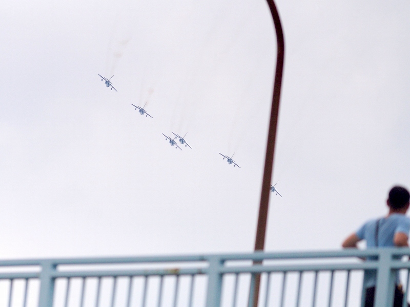 いつものようにスモークを引きながらアプローチしてきますね。川に対して横向きにアプローチしてくるので会場の等々力公園からは正面からアプローチしてるんでしょうね。青空と低いところにある曇が入り混じった空模様なので条件はよくないけど、いっぱい撮って青空部分を選べばそれなりです(ちょっと色補正はしてますけどね)