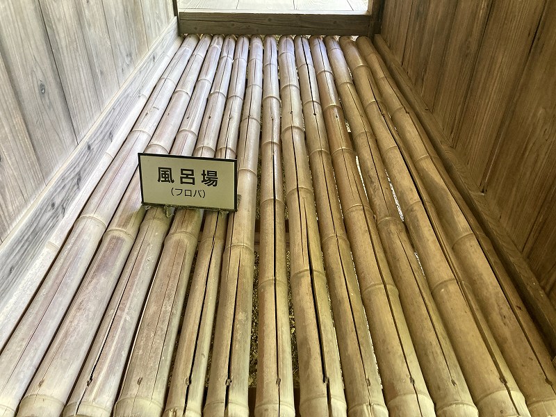 奥には畳の部屋があるから寝ない前提なのかもしれません。横に風呂場があったけど、こちらも竹の床でした。風呂場であれば水はけを考えて竹の床はいいかもしれません。