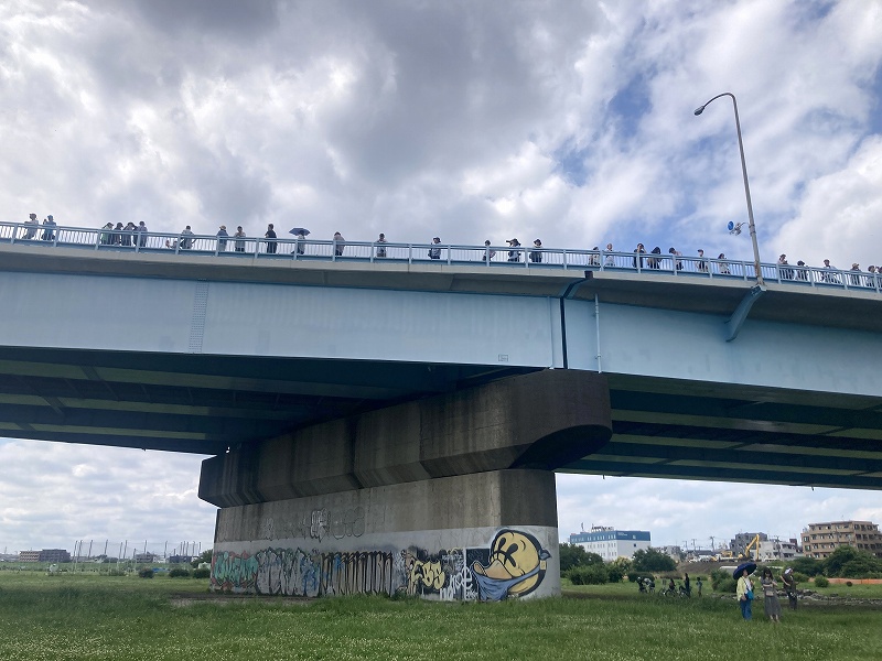 予定より少し早く入間基地を離陸したらしく早めに撮影場所(広場のど真ん中)で振り向いたら橋の上が凄い人になってました。河川敷にはチラホラしかいないと思ったら土手の上は大変なことになってました(笑)
