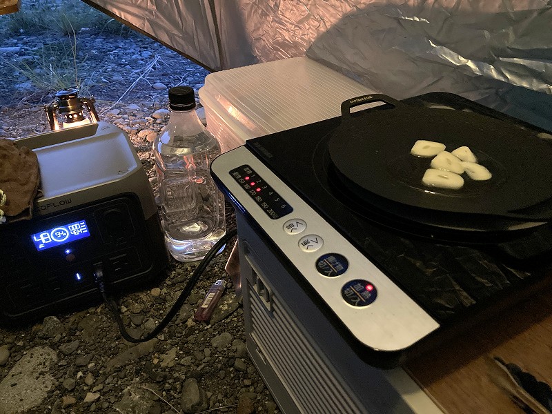 だいぶ前に災害対策として購入してあった「ポータブルバッテリー」と我孫子の家で使っていた「IHヒーター」を使って調理してみましたが、火加減を気にしなくていいのが楽ですね。車内で使うと油まみれになりそうなのでカーサイドタープの下で使いのがいいでしょう〜