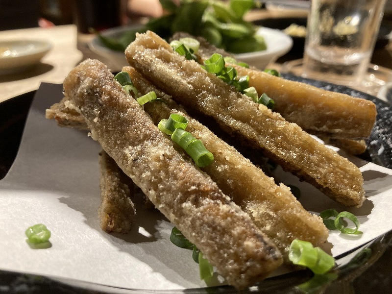 次は「天鸞一(てんぽいち)」ですね〜、東北じゃなくて広島のお酒ですね。ごぼうの天ぷら あげたててごぼうの味がしっかりしていて美味しかった!イカメンチって何だろうと思ったらイカのさつま揚げのようです。ふわふわ!!