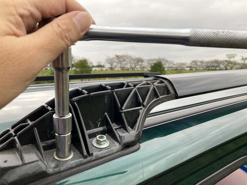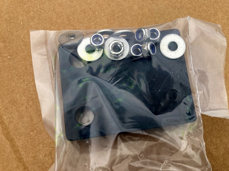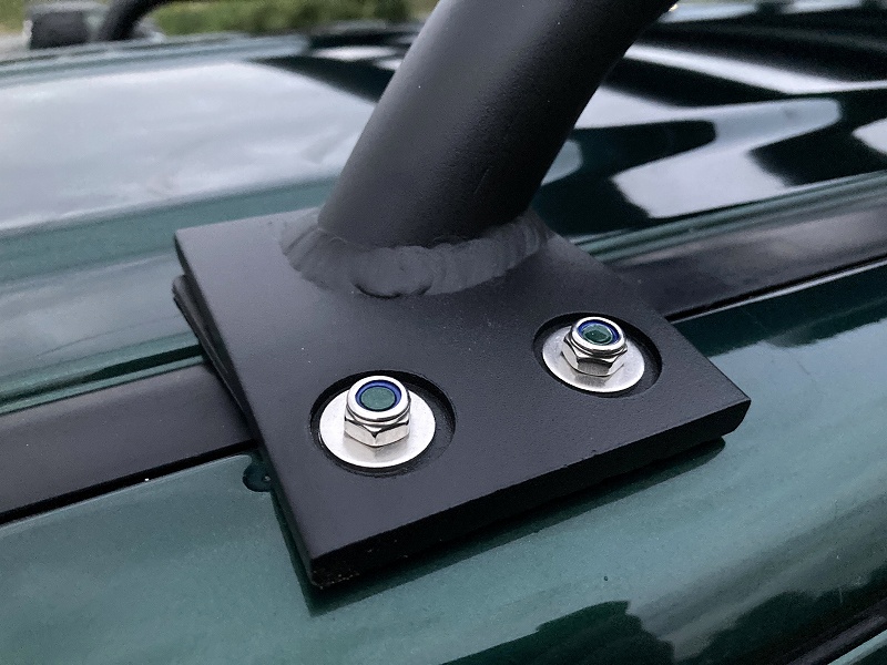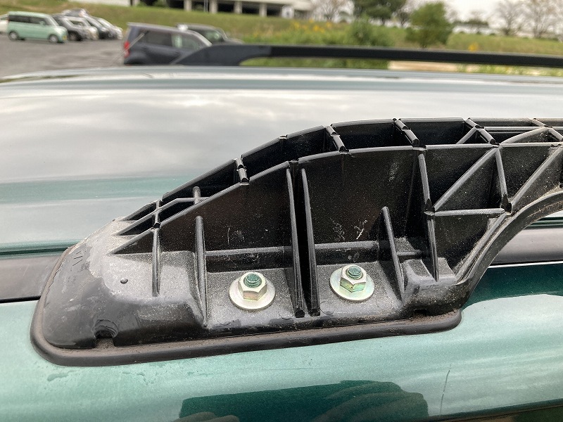 屋根に毛布を掛けて取り付けネジにゴムプレートを付けた状態です。この状態でおじちゃんお願いしてル-フラックをそっと毛布に載せてから滑らせてから最後に持ち上げてネジをはめることが出来ました。あとはアルミのワッシャーをはめてアルミナットを締めて固定していくだけです。今回のルーフキャリアの説明ではナットはル-フレールに使われていたスチールナットを再利用するように書かれていたけど、アルミワッシャとアルミナットが同梱されていました。要望が多かったんでしょうね〜