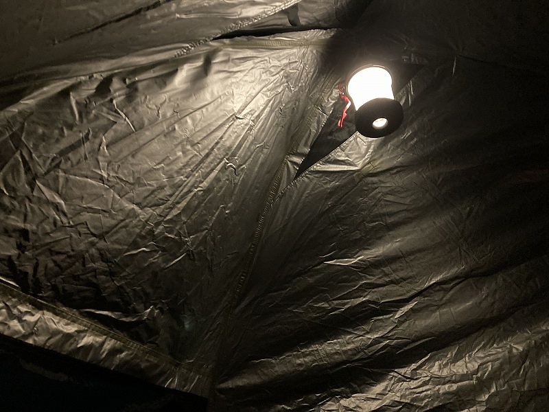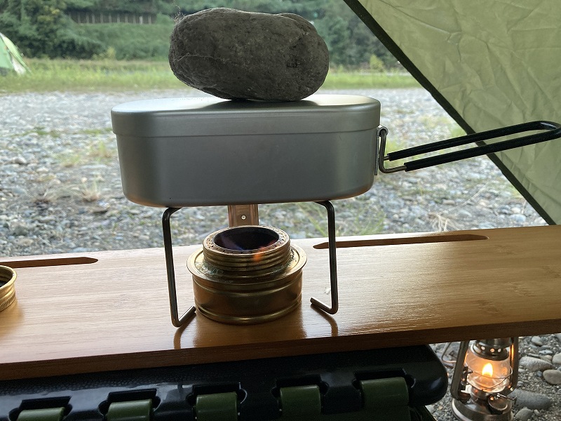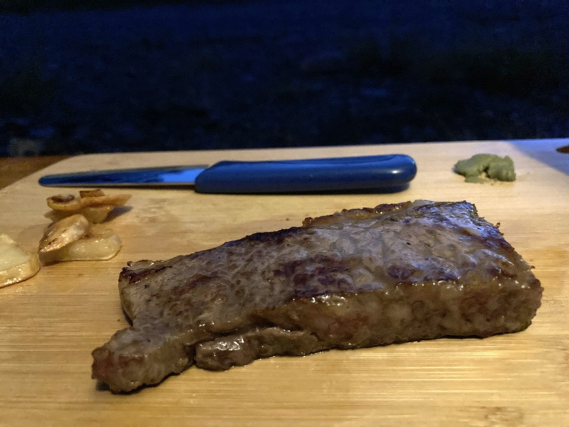 ちょっと暗くなってきたのでランタン点けてご飯を炊く準備しましょう。まだ秋なのでどんどん寒くなってきますね。今回はソロキャンプ用の「マルチグリドル」を持って来たので、野菜やお肉を焼いてワサビや塩で食べました。ご飯も上手にたけたので大満足!!